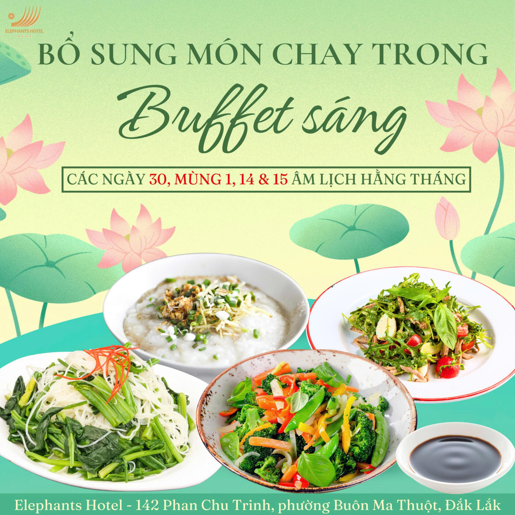 Nhằm đáp ứng nhu cầu ẩm thực chay ngày càng đa dạng, đặc biệt vào những ngày đầu và giữa tháng âm lịch, Elephants Hotel bổ sung các món chay trong buffet sáng, để mỗi Quý khách đều có thể an tâm lựa chọn bữa sáng phù hợp với thói quen và giá trị cá nhân của mình.