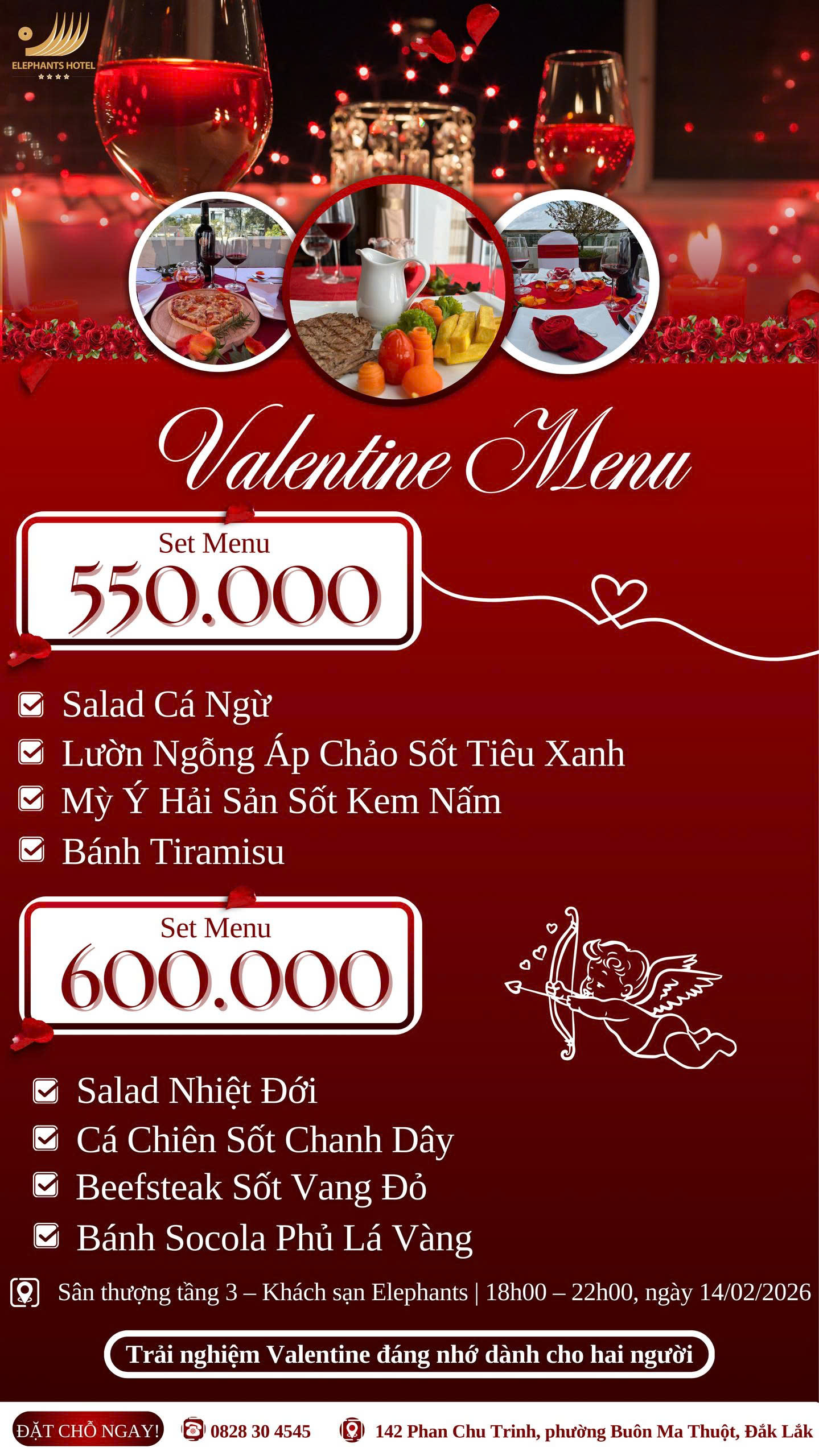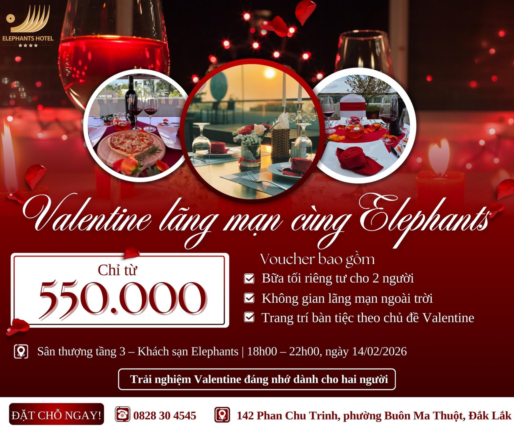 Lễ Tình Nhân này, đừng chỉ hẹn hò cho có — hãy dành cho người thương một buổi tối thật trọn vẹn với bữa tiệc Valentine ấm áp, chỉnh chu và đầy cảm xúc tại Elephants Hotel ✨